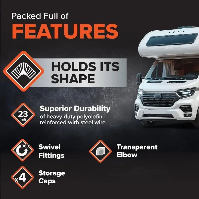 Rugged, Flexible Build: Constructed with 23 mils of durable polyolefin and reinforced with steel wire, the RhinoFLEX RV waste hose can bend and maintain its shape for reliable, long-lasting use.